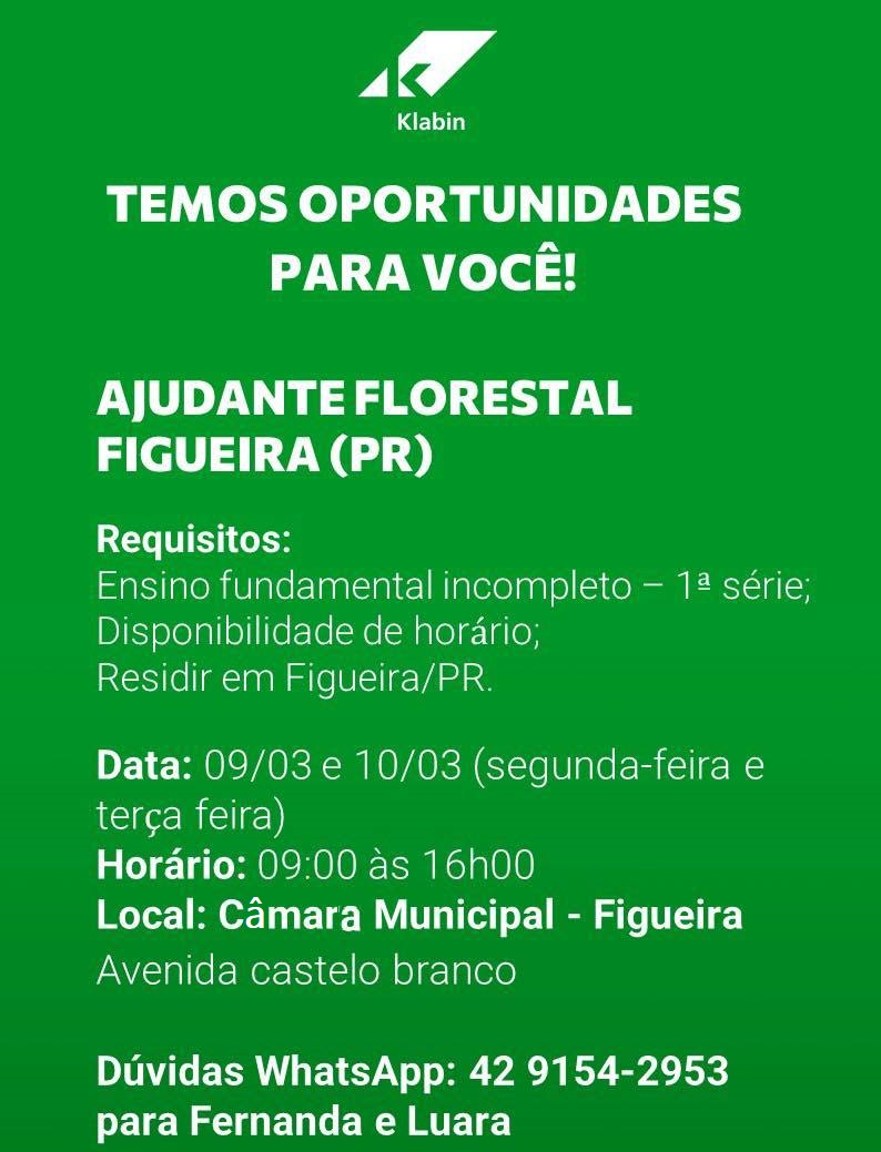 Figueira anuncia vagas de ajudante florestal na Klabin. (PMF)