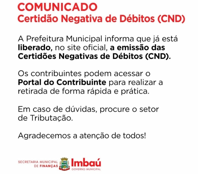 IMBAÚ: Emissão de Certidão Negativa de Débitos (CND) já está disponível no site oficial. (PMI)