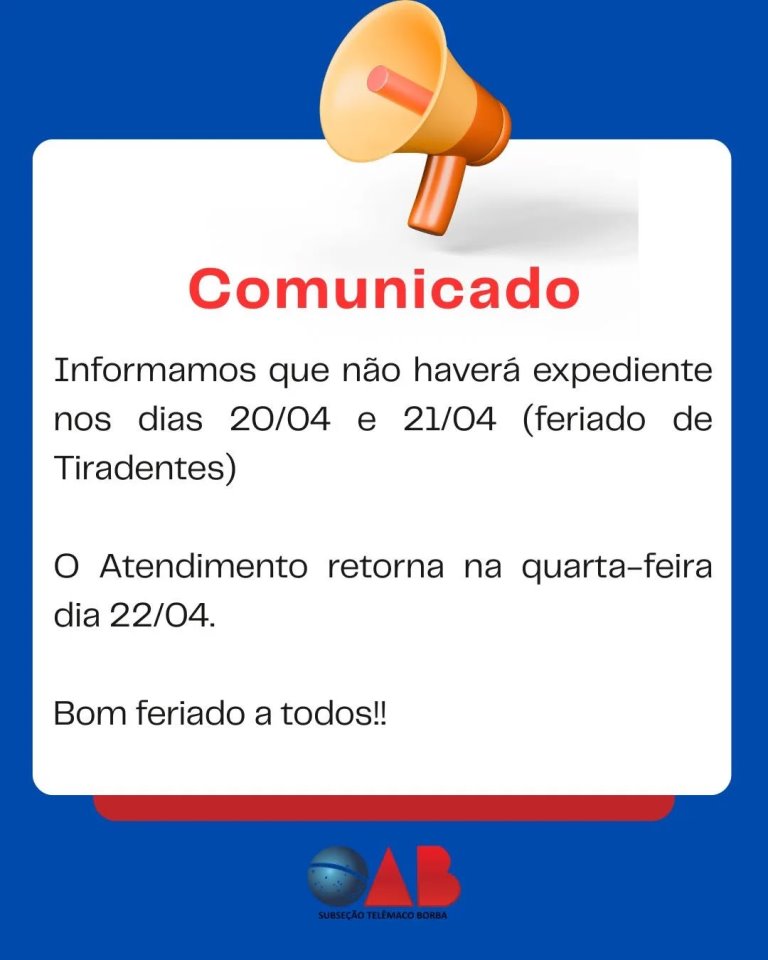 Devido ao feriado, Subseção da OAB volta com atendimento normal no dia 22, quarta-feira