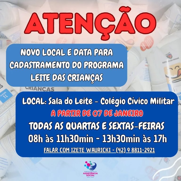 Em Reserva, 🚨 Atenção, famílias! 📌 Cadastro do Leite das Crianças 🗓️ 17, 18 e 19 de dezembro 📍 Sala do Leite – Colégio Cívico Militar 📞 (42) 9 8811-2921 – com Izete Wauricki (PMR)