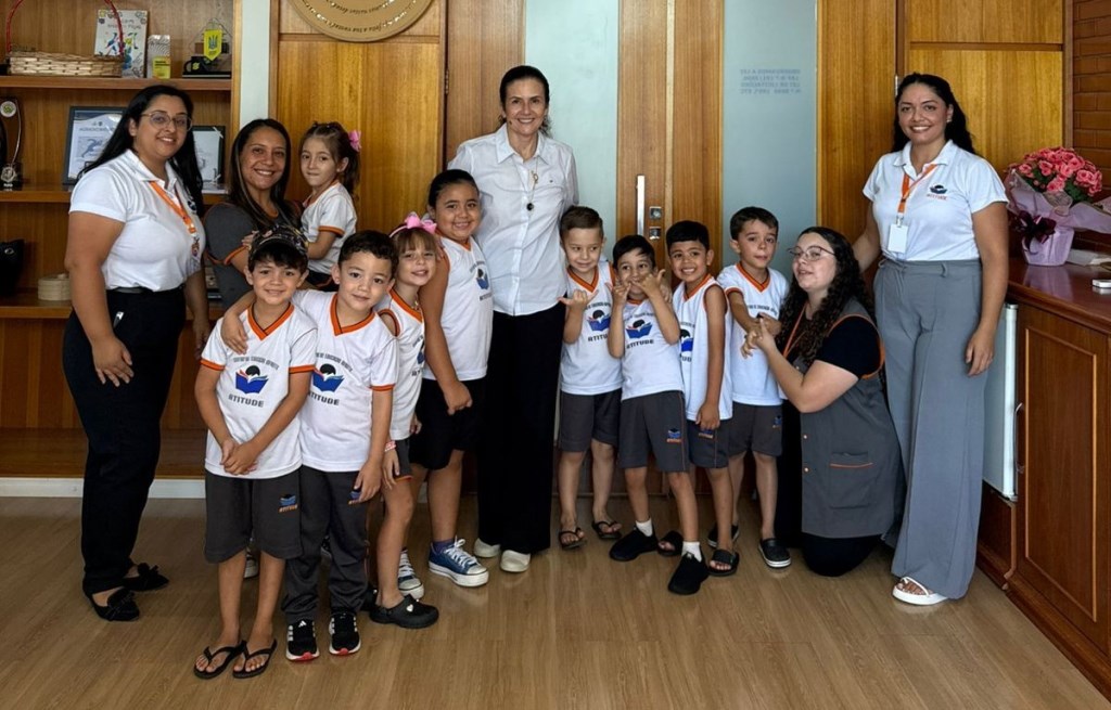 No período da tarde foi a vez dos alunos de cinco anos da Escola Atitude visitarem a prefeita. Eles estão estudando sobre o aniversário de Telêmaco Borba e ensinando sobre a importância do município, e entre esses aprendizados estava conhecer a prefeita.