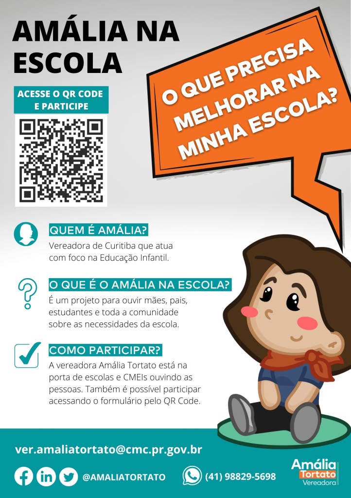 PROJETOS - A vereadora também desenvolve em Curitiba alguns projetos que permitem que a população tenha mais voz ao falar sobre os problemas da cidade. Um dos projetos se chama “Amália na Escola” e é desenvolvido em parceria com a comunidade escolar. A Amália vai até a frente das escolas e conversa com mães, pais e familiares dos estudantes sobre as melhorias necessárias em cada creche e escola da capital.