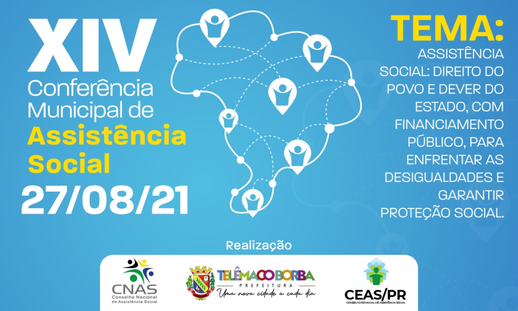 2021-08-26 às 07:26:48) A Prefeitura de Telêmaco Borba realiza nesta sexta-feira (27), a partir das 13h30, a XIV Conferência Municipal de Assistência Social, sob o tema: “ Assistência Social: Direito do povo e dever do Estado, com financiamento público, para enfrentar as desigualdades e garantir proteção social.”