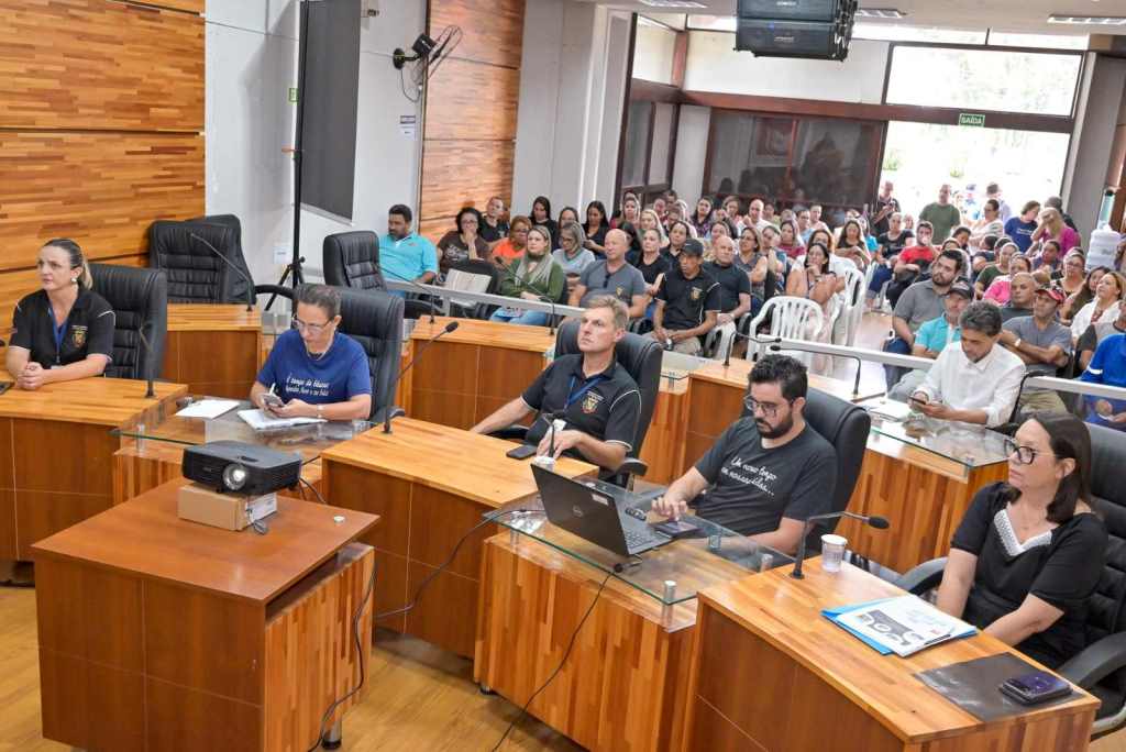 26/02/26 às 08:02:41) A Secretaria Municipal de Educação realizou, no dia 24 de fevereiro, no Plenário da Câmara de Vereadores de Telêmaco Borba, a 1ª Audiência Pública das Ações de Manutenção e Infraestrutura Escolar em Foco. O encontro foi conduzido pelo secretário Dr. Eros Danilo Araújo e reuniu diretores, representantes dos Conselhos Escolares, técnicos da Secretaria, membros do Conselho Municipal de Educação, do Conselho da Alimentação Escolar, do Conselho do FUNDEB, vereadores, o vice-prefeito Jefferson Abreu e a comunidade.