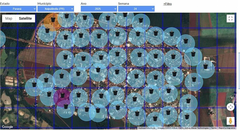 Os dispositivos serão instalados em residências previamente selecionadas, tanto na área urbana quanto na Vila Rural, respeitando um raio de cobertura de aproximadamente 300 metros por armadilha.