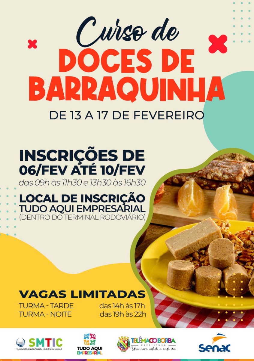 2023-02-02 às 07:15:34) A Prefeitura de Telêmaco Borba, por meio da Secretaria Municipal do Trabalho e da Indústria Convencional (SMITC), estará com inscrições abertas, de 06 a 10 de fevereiro, para o curso Doces de Barraquinha.