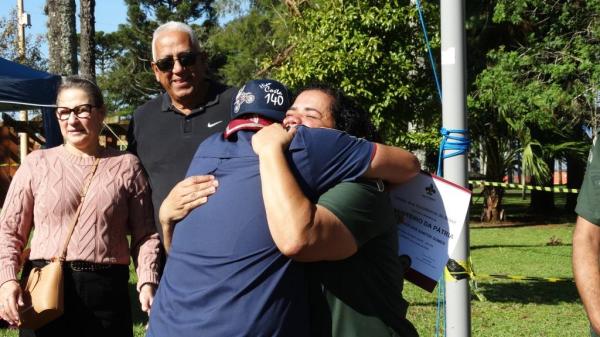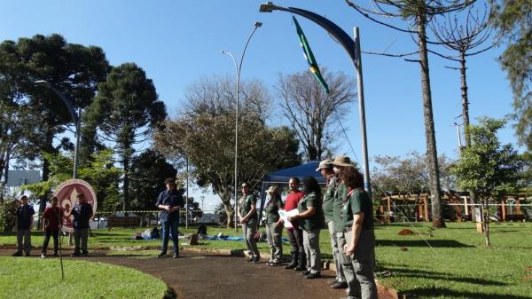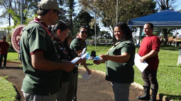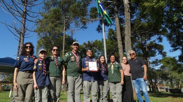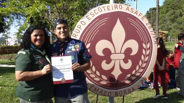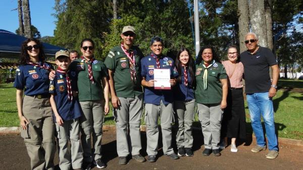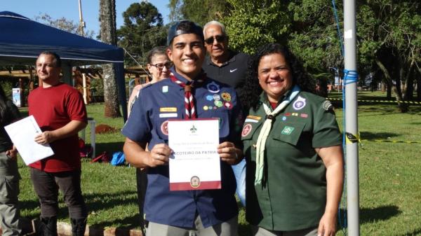 28/06/25 às 21:08:29) Na Praça Luba Klabin, Praça dos Pinheiros, aconteceu hoje em Telêmaco, a entrega do distintivo à Vinícius dos Santos Gomes, como "Escoteiro da Pátria", que é o grau máximo de reconhecimento no Ramo Sênior do Movimento Escoteiro no Brasil. A concessão deste é feita à jovens que demonstram compromisso exemplar com o escotismo e com a sociedade, após terem cumprido todos os requisitos de progressão no ramo, incluindo a realização de atividades, conquistas de especialidades e insígnias, e recomendação dos escotistas e da Corte de Honra da tropa.
