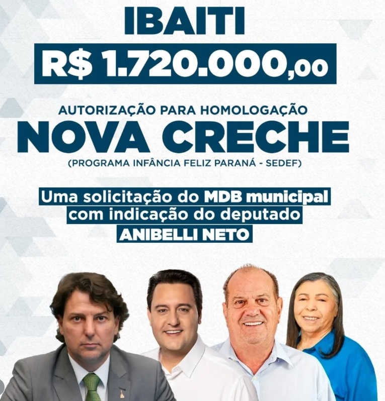 Ibaiti avança com a autorização para homologação de uma nova creche, por meio do Programa Infância Feliz Paraná, um investimento de R$ 1.720.000,00 que fortalece a educação infantil e amplia o cuidado com nossas crianças e famílias.