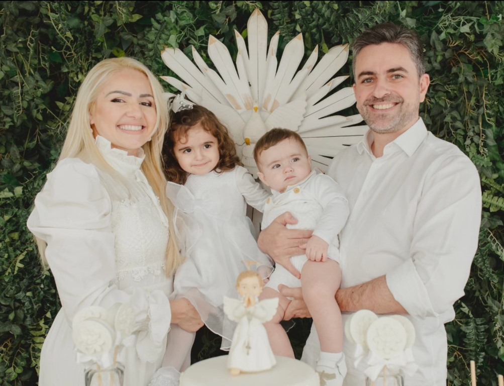 THAISE SOUZA RUIZ, num lindo registro com o casal de filhos, e o esposo, Lúcio Ricardo Ferrari Ruiz, que fez niver, dia 04. Eles são de Jandaia. Ela compõe o Sicredi.