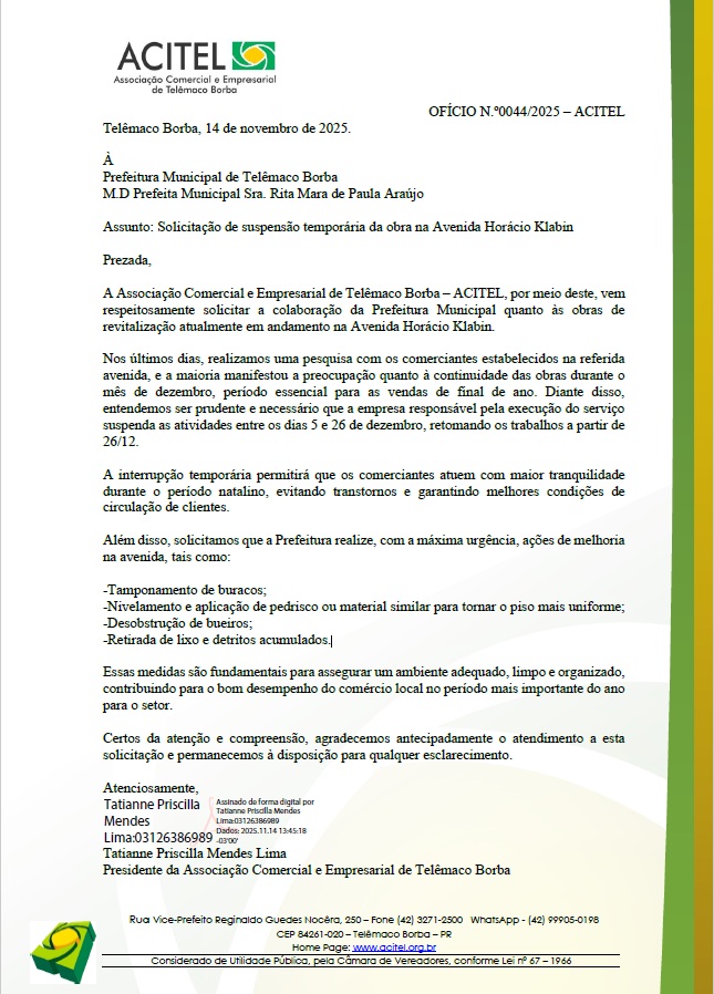 19/11/25 às 08:40:34) Atendendo a um pedido da Associação Comercial de Empresarial de Telêmaco Borba (ACITEL), a Prefeitura Municipal de Telêmaco Borba suspenderá as obras de revitalização da Avenida Horácio Klabin entre os dias 05 a 25 de dezembro. As obras voltarão a acontecer normalmente a partir do dia 26 do próximo mês.