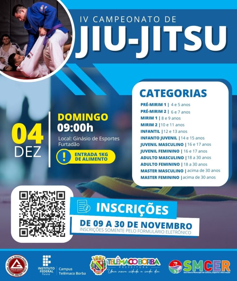 2022-11-17 às 08:27:56) A Secretaria Municipal de Cultura, Esportes e Recreação (SMCER) está com as inscrições abertas para o IV Campeonato de Jiu-Jitsu de Telêmaco Borba. O evento promovido pela Prefeitura de Telêmaco Borba será realizado no dia 04 de dezembro (domingo), às 9h, no Ginásio de Esportes Heitor de Alencar Furtado (Furtadão), com a entrada a doação de um quilo de alimento não perecível e é aberto a participação de atletas da região.