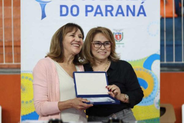 Professora Hilda Aparecida de Almeida sendo homenageada e recebe a honraria pela chefe do NRE, professora Sueli Martins.
