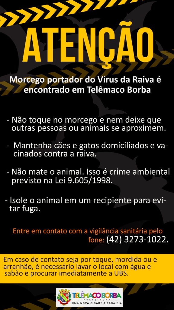2022-04-05 às 07:40:03) A Vigilância Sanitária de Telêmaco Borba alerta que, no dia 27 de março, foi capturado um morcego em uma residência no bairro Rio Alegre e após exame, foi obtido laudo positivo para raiva.