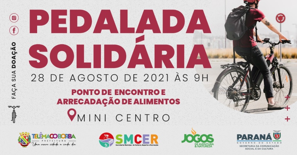 2021-08-24 às 07:24:06) A Prefeitura, por meio da Secretaria Municipal de Cultura, Esportes e Recreação (SMCER), realiza, no próximo sábado (28), a Pedalada Solidária. O evento, aberto para todas as idades, é em parceria com Governo do Paraná.