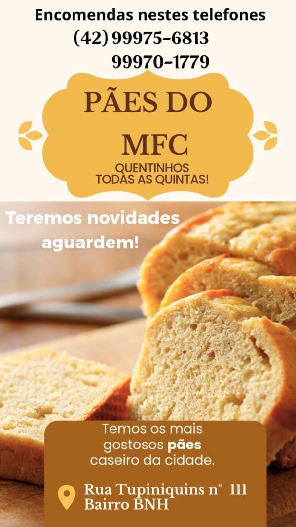 17/07/25 às 19:31:53) E toda quinta-feira, o Movimento Familiar Cristão (MFC), de Telêmaco Borba, na Rua Tupiniquins, no BNH, prepara os pães mais quentinhos e deliciosos! Também, bolacha caseira e cueca virada!