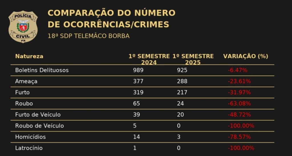 Aconteceu na noite de ontem (12), nas dependências da Câmara Municipal de Telêmaco, a apresentação, pela Polícia Civil, na pessoa do delegado titular da 18ª Subdivisão, Dr. João Paulo Menuzzo Lauandos, do relatório de desempenho, com análise estatística, do primeiro semestre, que refletiu os avanços que a cidade tem mostrado, na contenção da criminalidade.