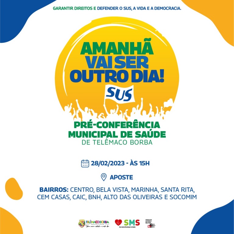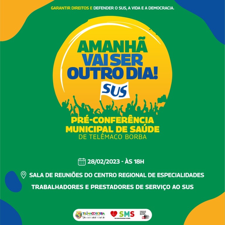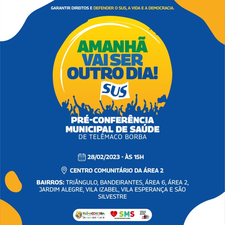 2023-02-23 às 09:38:12) A Prefeitura Municipal de Telêmaco Borba em parceria com a Secretaria Municipal de Saúde e o Conselho Municipal de Saúde convida toda a comunidade para participar das Pré-Conferências Municipais de Saúde, que antecedem a Conferencia Municipal de Saúde, e serão realizadas no dia 28 de fevereiro, na Aposte e no Centro Comunitário da Área 02, às 15 horas. E também a Pré-Conferência para trabalhadores e prestadores de serviço para o SUS, que acontece na Sala de Reuniões do CESPE, às 18 horas.