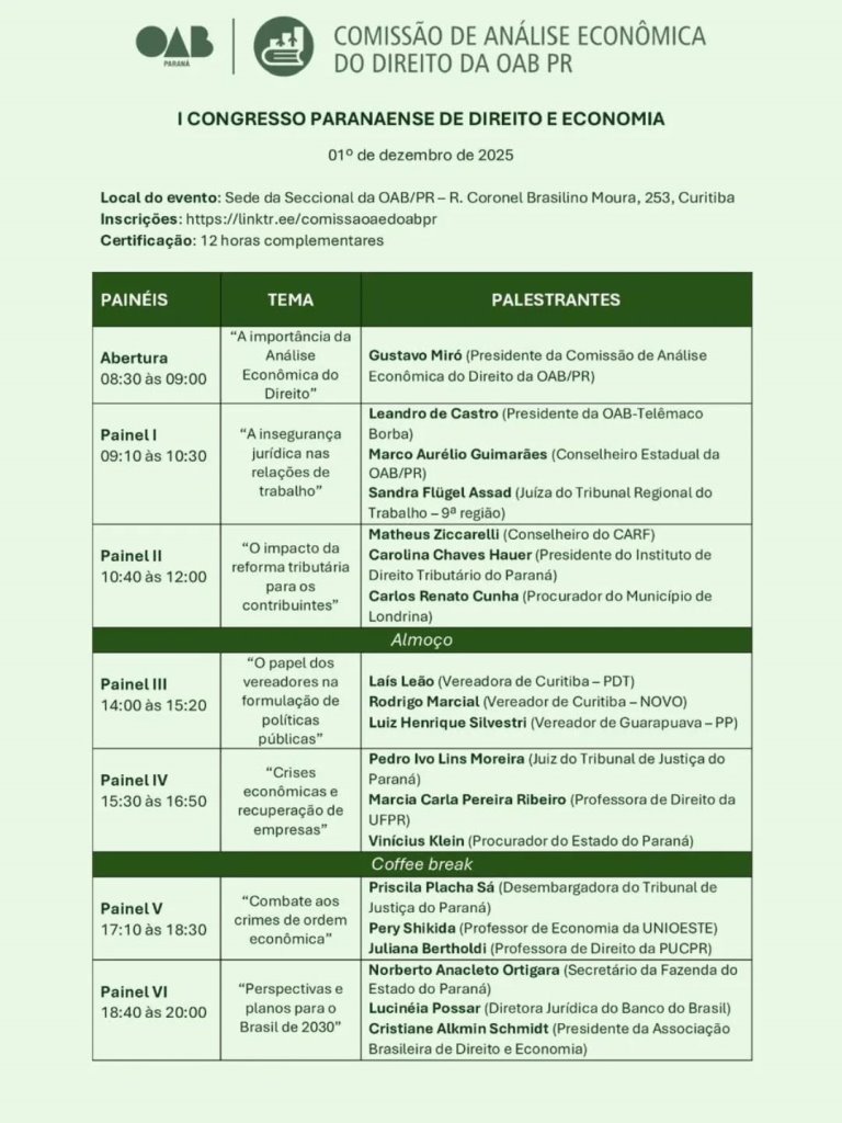 25/11/25 às 08:44:47) O presidente da Subseção da Ordem dos Advogados do Brasil, em Telêmaco Borba, Dr. Leandro de Castro, será um dos palestrantes no I Congresso Paranaense de Direito e Economia, evento promovido pela Comissão de Análise Econômica do Direito da OAB-PR.