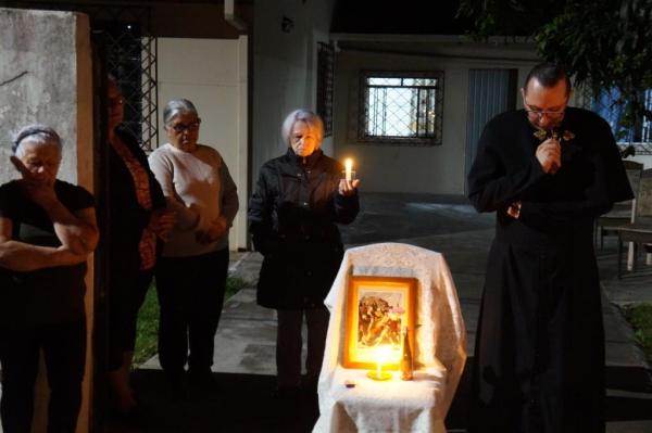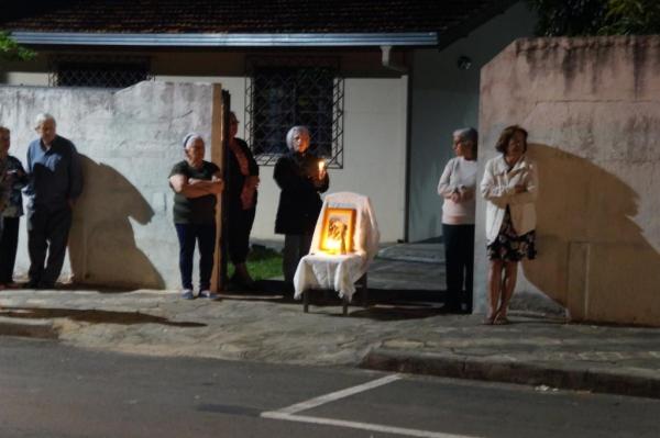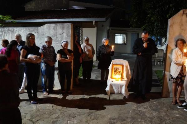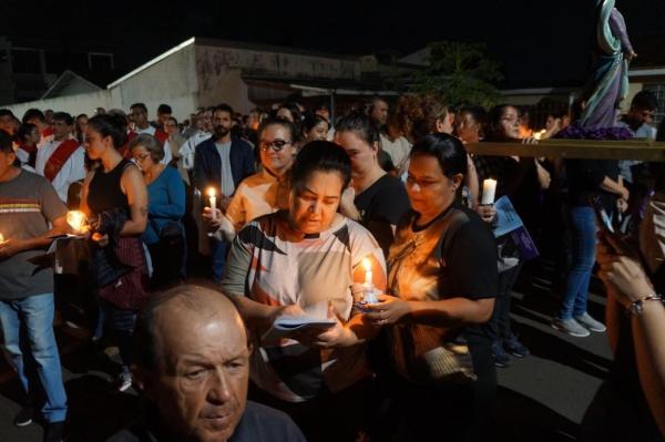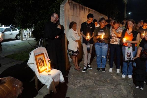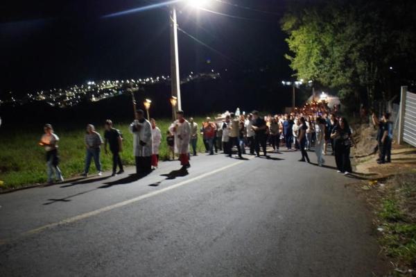 No percurso, a celebração da via-sacra tinha pausa, conforme na frente da casa de paroquianos, reunidos com suas famílias, se davam as contemplações das estações. O rito foi conduzido pelo pároco, o padre Sandro Maciel Cândido Ferreira.