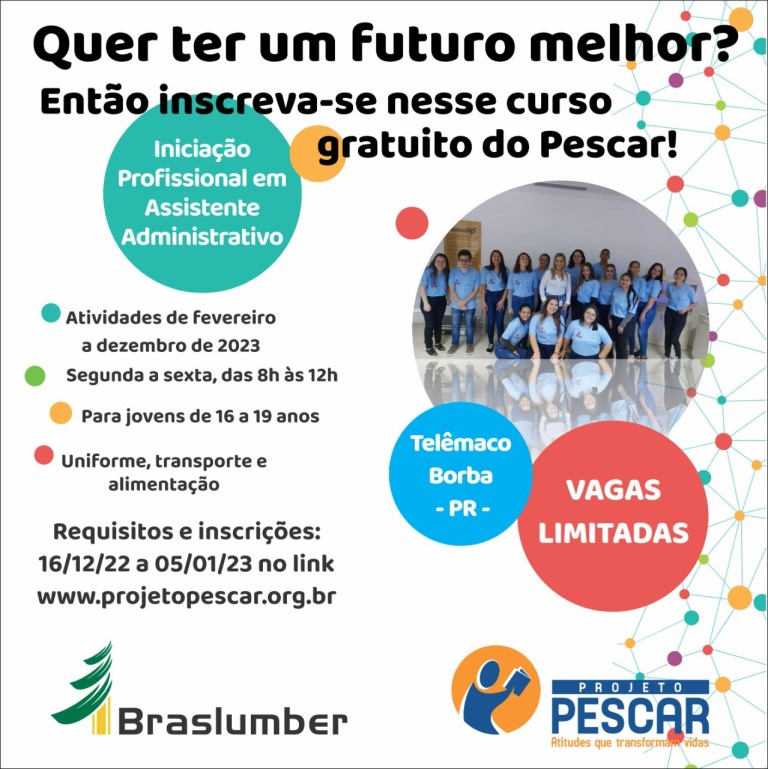 2023-01-04 às 07:13:16) O Projeto Pescar, está com inscrições abertas até a próxima quinta-feira (05), para iniciação profissional em Assistente Administrativo. As atividades ocorrerão de fevereiro a dezembro de 2023. Aos selecionados oferece-se uniforme, transporte e alimentação.