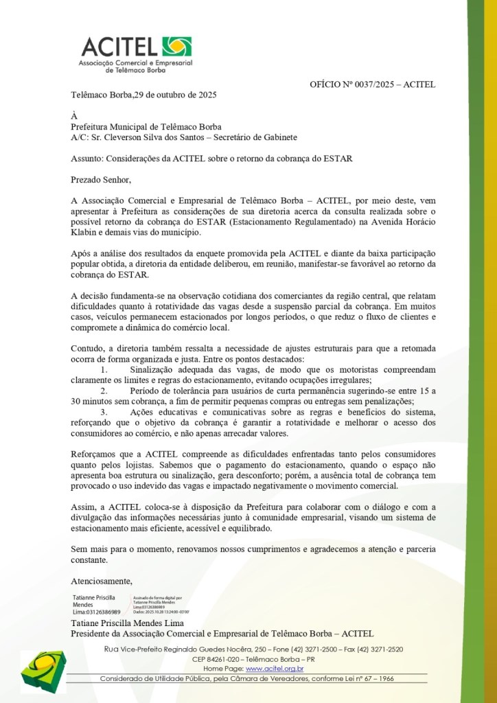 A decisão atende à solicitação da Associação Comercial e Empresarial de Telêmaco Borba (ACITEL), formalizada por meio do Ofício Nº 0037/2025. No documento, a entidade que representa os comerciantes do município manifestou-se favorável ao retorno da cobrança, após consulta junto à sua diretoria.