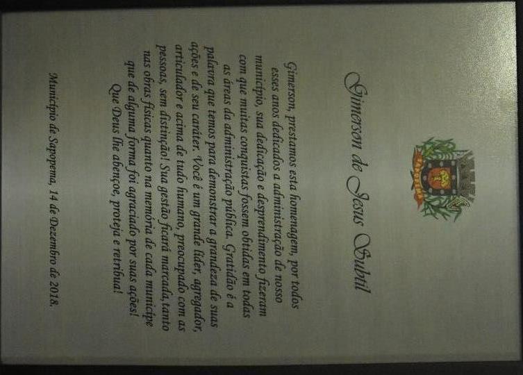 Culminou no evento, a homenagem ao prefeito que se licenciou a alguns dias, Gimerson de Jesus Subtil. Unanimemente querido em toda a cidade e região, não se segurou e foi às lágrimas, com a projeção de depoimentos de familiares, filhos e netos, e dos funcionários diretos e secretários. Após, recebeu uma placa de reconhecimento por tantos anos lutando em prol da cidade, seja como vereador, vice-prefeito e prefeito. Nela, em um dos trechos, essa tocante mensagem: “Você é um grande líder, agregador, articulador, e acima de tudo humano, preocupado com as pessoas, sem distinção!”.