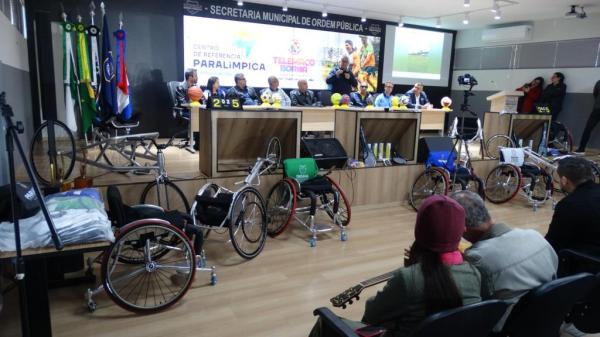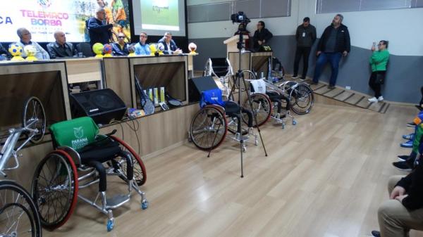 Ao todo foram entregues cinco cadeiras de rodas de atletismo, cinco cadeiras de rodas de parabadminton, duas petras, kit badminton, bolas, além de acessórios esportivos, como apitos, cronômetros, kit de coletes esportivos, bombas, placares de mesa, saco de transporte de materiais, entre outros equipamentos.