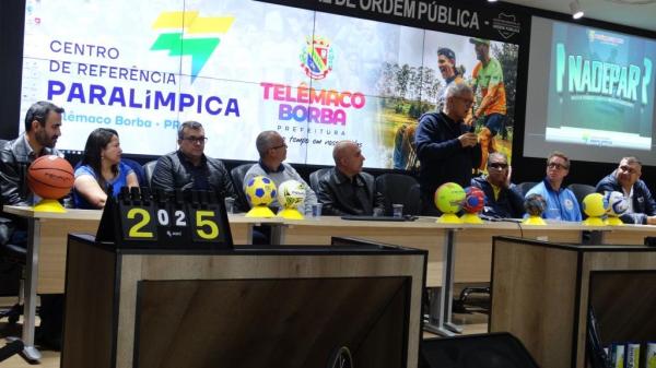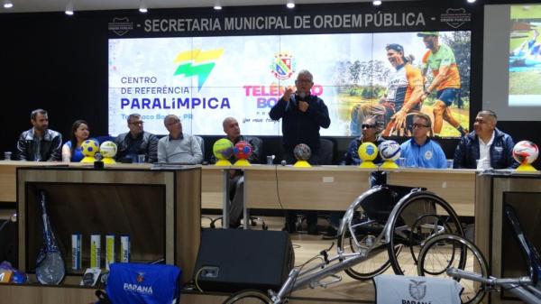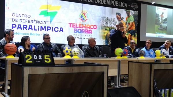 17/07/25 às 08:33:10) O secretário de Esporte do Paraná, Hélio Renato Wirbiski, esteve na manhã de quarta-feira (16), no auditório da Secretaria Municipal de Ordem Pública, onde fez a entrega de vários materiais para o paradesporto de Telêmaco Borba.