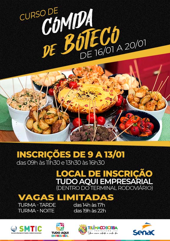 O primeiro curso a ser ofertado é o de Comida de Boteco. As inscrições estarão abertas de 09 a 13 de janeiro (segunda à sexta-feira) no Tudo Aqui Empresarial, dentro do Terminal Rodoviário, nos horários das 9h às 11h30 e das 13h30 às 16h30.
