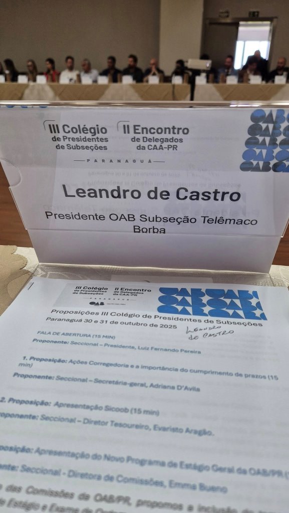 O presidente da Subseção da Ordem dos Advogados do Brasil, de Telêmaco Borba, Dr. Leandro de Castro; se faz presente no III Colégio de Presidentes da OAB/PR, que se dá neste ano, em Paranaguá, e representa a advocacia da Capital do Papel.