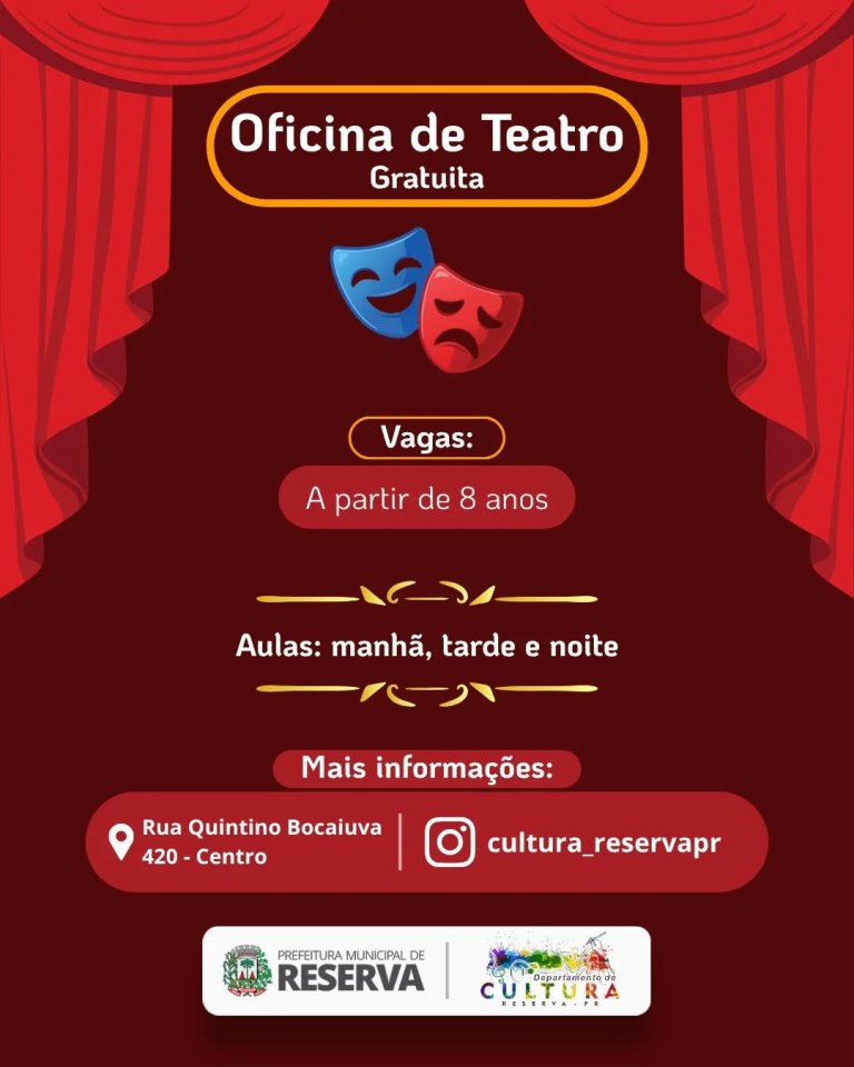 Em Reserva, inscrições para Aulas de Teatro, e em três turnos. (PMR)